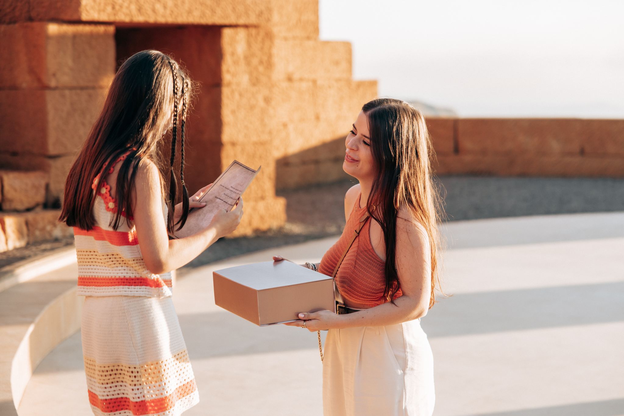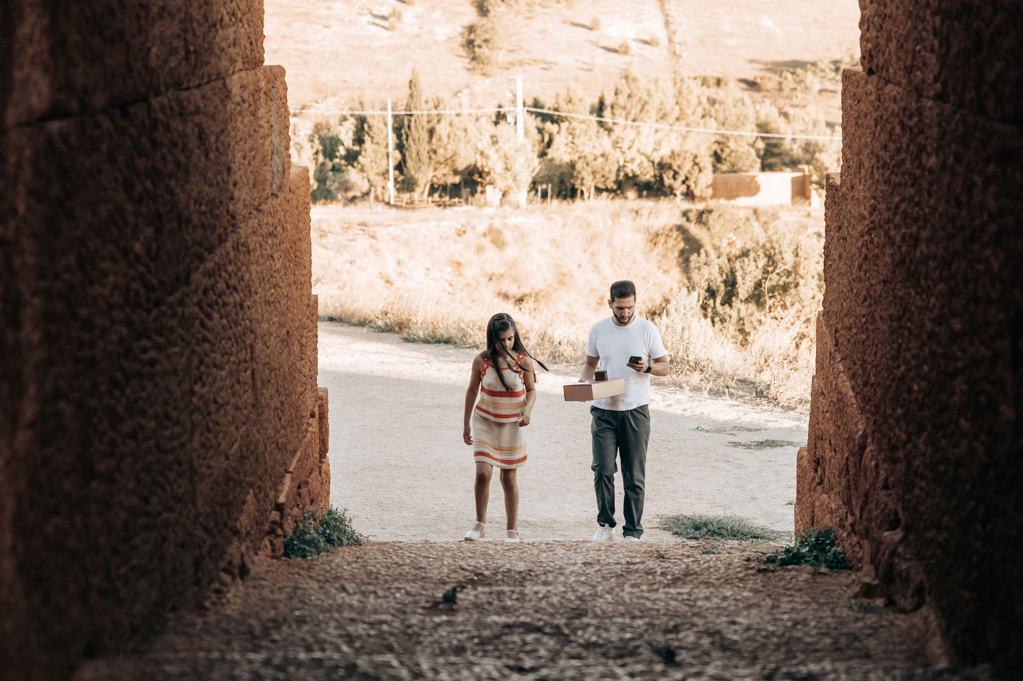 La proposta di matrimonio di Giovanni a Stefania al Teatro di Andromeda è uno di quei momenti sospesi, dove la sorpresa si intreccia con l’emozione più autentica. Stefania era arrivata al Teatro di Andromeda, semplicemente per vivere una giornata speciale in uno dei luoghi più suggestivi della Sicilia. Nessun indizio, nessuna attesa. Solo la bellezza del paesaggio e la magia di quel teatro di pietra sospeso tra cielo e natura. Nel frattempo, Giovanni aveva pianificato ogni dettaglio in gran segreto. Con la figlia di Stefania al suo fianco, ha raggiunto il luogo a sorpresa. Io ero lì, pronto a documentare con discrezione e professionalità ogni singolo istante, senza interferire con la spontaneità di ciò che sarebbe accaduto. Quando gli sguardi si sono incrociati, il tempo ha rallentato.
